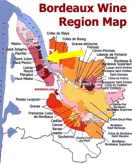 The region occupies the left bank of the Gironde estuary from the mouth of the river to the city of Bordeaux and includes the four famous communes of St-Estephe, Pauillac, St. Julien and Margaux. It is 60 km long from north to south, and about 10 km wide. The production estimation is about 50 million litres per year of red wine.